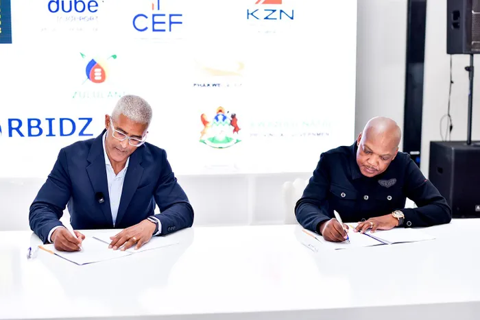 Oliver Naidu, project owner and director of ZET, signs the MOU alongside RBIDZ CEO, Thabane Zulu.