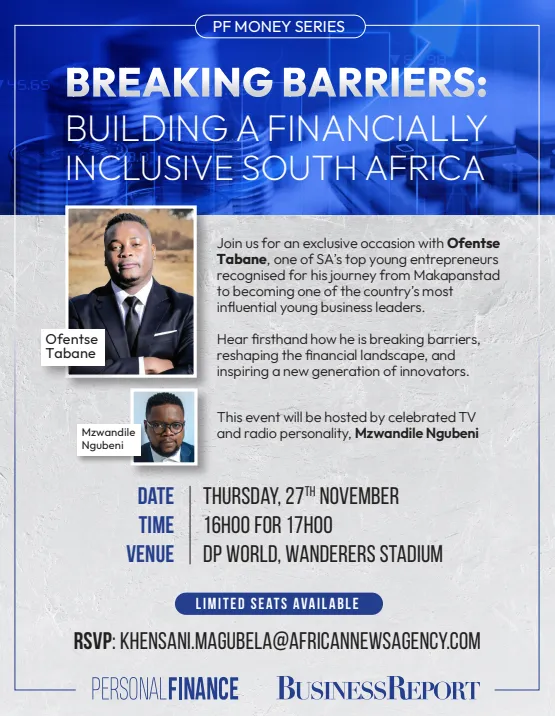 Personal Finance will host its inaugural PF Money Series event, themed "Breaking Barriers: Building a Financially Inclusive South Africa." The event will take place on November 27 at Wanderers Stadium, bringing together leading voices from banking, fintech, policy, advisory, and consumer advocacy.