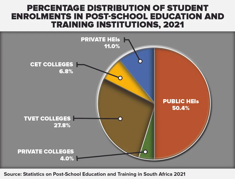 It is estimated that there were 2.55 million students enrolled across all tertiary institutions (universities and Technical and Vocational Education and Training colleges (TVET)) in South Africa in 2020. Public universities make up the largest portion (44.9% of all students), followed by TVET colleges (30.9%).