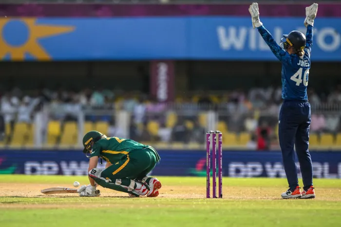 England's Amy Jones (right) successfully appeals for leg before wicket (LBW) against South Africa's Anneke Bosch during the ICC Women's Cricket World Cup 2025 one-day international (ODI) match at the Barsapara Cricket Stadium in Guwahati on Friday. | AFP