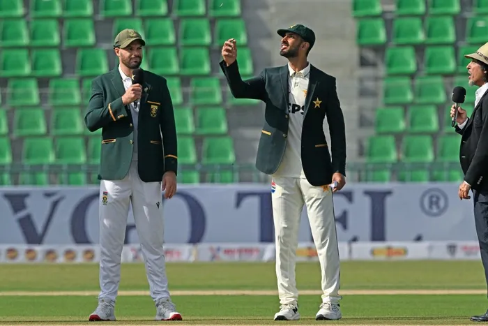 Pakistan captain Shan Masood and Proteas counterpart Aiden Markram at the toss ahead of the first Test in Lahore on Sunday. Picture: AFP