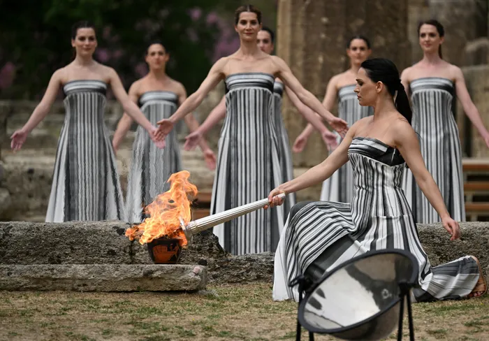 Greek actress Mary Mina, playing the role of the High Priestess, lights the torch during the flame lighting ceremony for the Paris 2024 Olympics Games at the ancient temple of Hera on the Olympia archeological site, birthplace of the ancient Olympics in southern Greece, on April 16, 2024. (Photo by Aris MESSINIS / AFP)