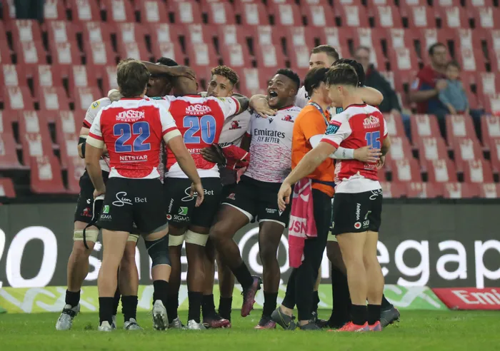 The Lions’ players celebrate at the end of their United Rugby Championship game against Edinburgh at Ellis Park in Johannesburg on Saturday The Lions’ players celebrate at the end of their United Rugby Championship game against Edinburgh at Ellis Park in Johannesburg on Saturday. Photo: Gavin Barker/BackpagePix
