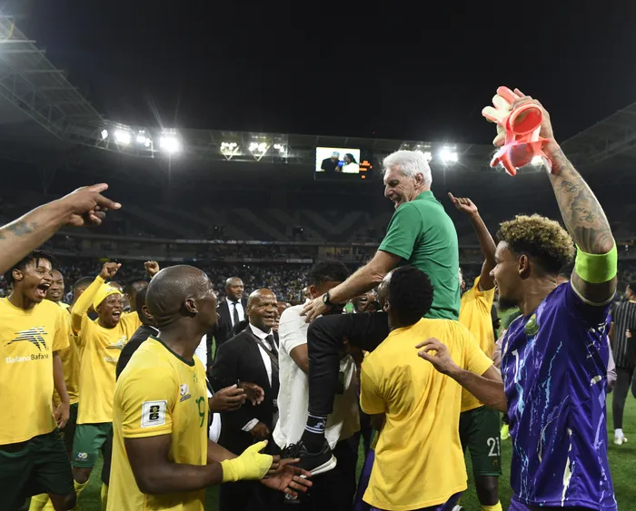 Hugo Broos coach of Bafana Bafana celebrates with his players as they hlift him up to the respect of the nation after South Africa qualified for the 2026 Fifa World Cup on Tuesday night. | BackpagePix