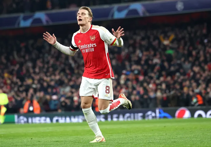 Arsenal captain Martin Odegaard celebrates after scoring his team's fifth goal during their Champions League matchagainst RC Lens. Arsenal captain Martin Odegaard celebrates after scoring his team's fifth goal during their Champions League matchagainst RC Lens. Picture: Andy Rain / EPA