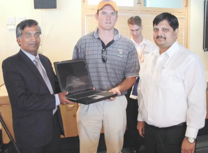 Graeme Smith receives a notebook computer some years earlier from then Consul-General Suresh Goel, left, as Sahara Computers managing director Atul Gupta looks on. File photo Graeme Smith receives a notebook computer some years earlier from then Consul-General Suresh Goel, left, as Sahara Computers managing director Atul Gupta looks on. File photo