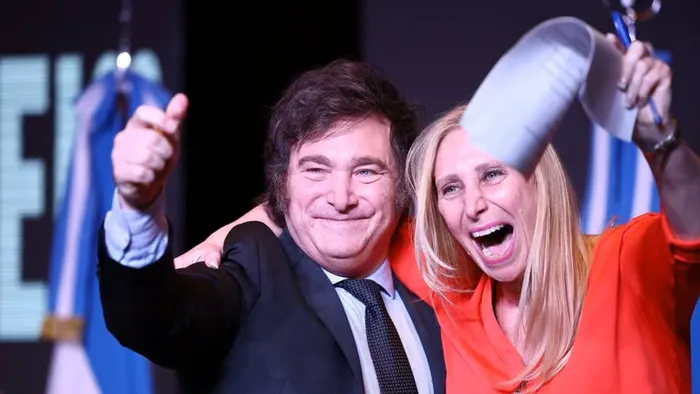 Argentine president-elect Javier Milei and his sister Karina Milei react to the results of Argentina's run-off presidential election, in Buenos Aires, Argentina.
